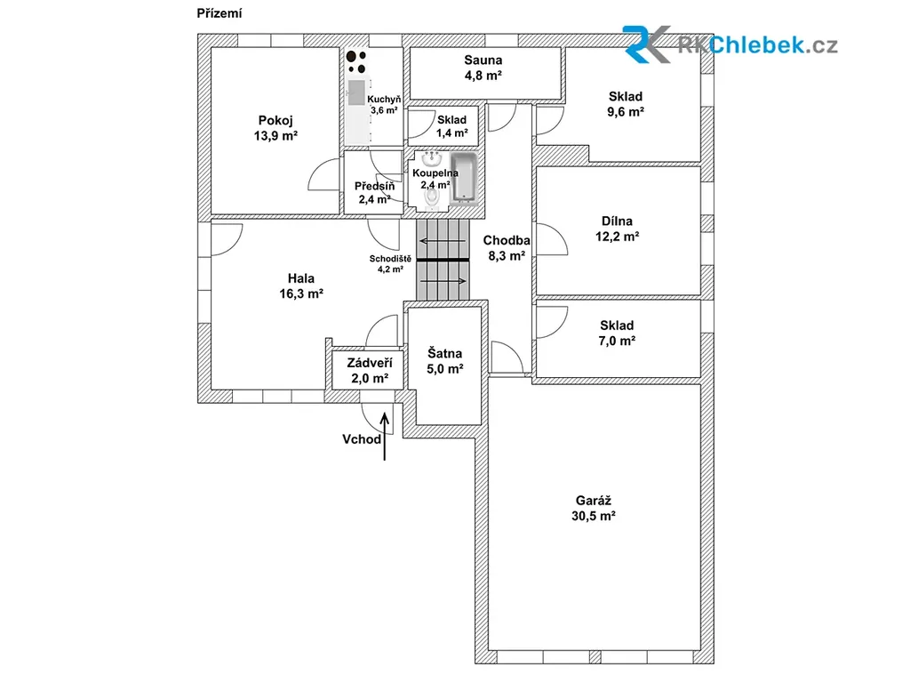 Suterén: po schodišti se dostaneme do sklepních prostor, které nabízejí dostatek místa pro skladování, technické zázemí či domácí dílnu.
