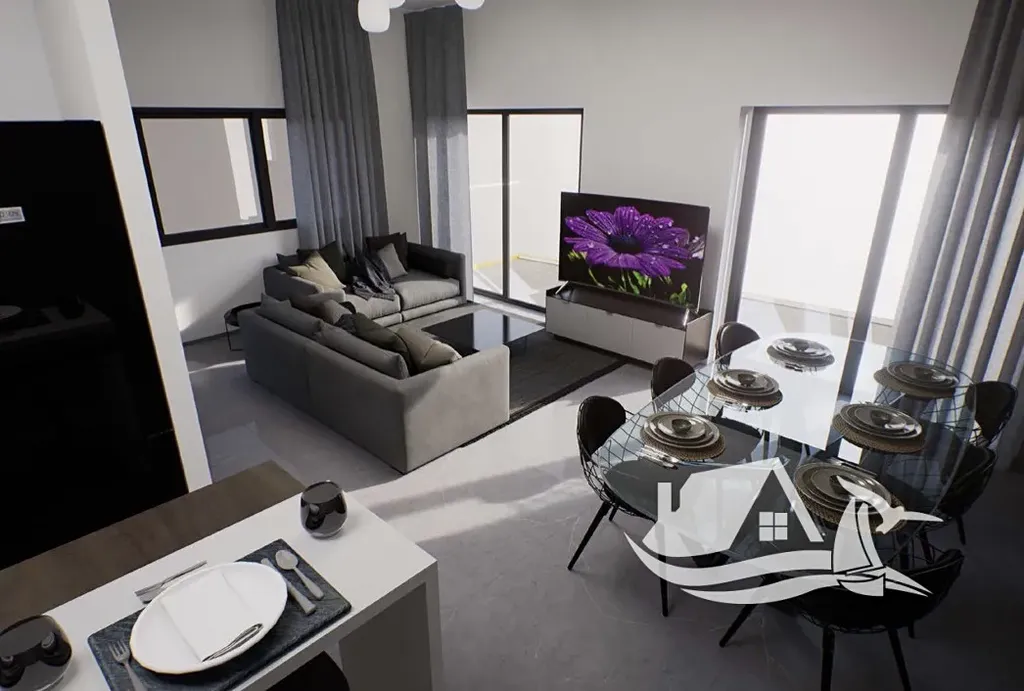Dispozice bytu je promyšlená do detailu. Světlý obývací prostor s kuchyní vytváří otevřenou a vzdušnou atmosféru, vhodnou pro každodenní život i relax. Dvě samostatné ložnice poskytují dostatek soukromí a jsou ideální pro rodinné využití nebo pro hosty. Moderní koupelna, kvalitní materiály a elegantní dokončení podtrhují celkový charakter bytu. K dispozici je také krytá veranda, která nabízí příjemný venkovní prostor pro ranní kávu či večerní posezení.