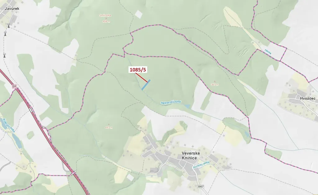 Lesní pozemek o výměře 3926 m2, parcelní číslo 1085/5, podíl 1/1, katastrální území Veverské Knínice, obec Veverské Knínice, obec s rozšířenou působností Rosice, okres Brno-venkov, Jihomoravský kraj. Po těžbě.