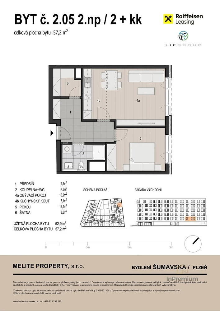 Nabízíme byt 2+kk o celkové ploše 57,2 m² v 2. nadzemním podlaží projektu Bydlení Šumavská – moderní novostavby přímo v centru Plzně. Byt disponuje praktickou dispozicí s oddělenou šatnou (3,6 m²), prostornou předsíní (9,6 m²), světlým obývacím pokojem s kuchyňským koutem (celkem 23 m²) a ložnicí o velikosti 12,1 m². Koupelna je řešena jako koupelna s WC. Orientace bytu na východ přináší příjemné ranní světlo. Byt je ve standardním provedení s možností individuálních úprav prostřednictvím klientských změn. Projekt se aktuálně nachází ve výstavbě – dokončení je plánováno na podzim 2027. Samozřejmostí je sklepní kóje, k bytu lze dokoupit garážové stání. Bydlení Šumavská je jedinečný projekt s energetickou třídou A, který spojuje výhody městského života s moderním komfortem, nízkými provozními náklady a kompletní občanskou vybaveností v okolí. Více informací na www. bydlenisumavska. cz