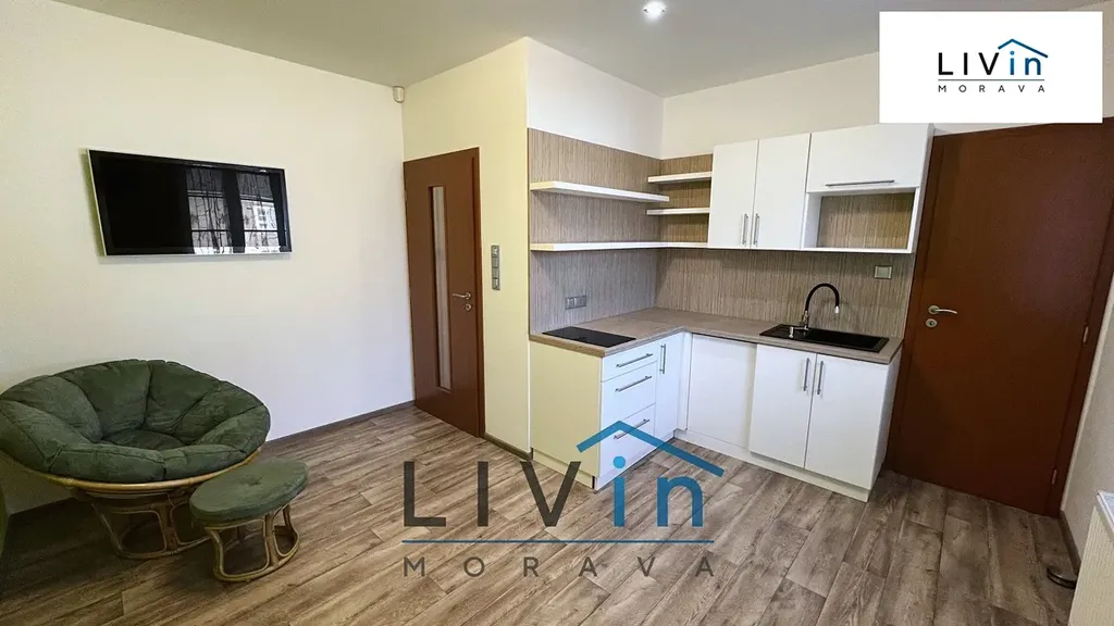 Kuchyň zahrnuje kuchyňskou linku, indukční varnou desku, křesílko a TV. Z kuchyně vedou dveře do komory/spižírny, kam je možné umístit lednici. V koupelně je prostorný sprchový kout, umyvadlovo, zrcadlo, pračka, WC i pisoár. Obývací pokoj původně sloužil jako kancelář a je vybaven sedačkou, konferenčníkm stolkem a velkým pracovním stolem (tento stůl je možno po dohodě přesunout mimo byt). V ložnici se nachází manželská postel, noční stolky a komoda.