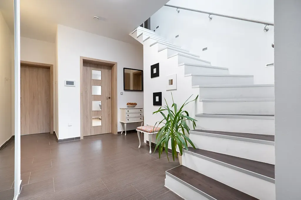 Dominantou interiéru je velkorysý otevřený obývací pokoj s jídelnou a moderní kuchyní s barovým pultem (celkem přes 50 m²). Odtud je přímý vstup na zastřešenou terasu 28 m², ideální pro celoroční posezení. V obýváku je připravena kompletní příprava pro krb. V přízemí dále najdete prostornou vstupní halu s vestavnou skříní, spíž, koupelnu se sprchou a WC, pracovnu a technickou místnost s přístupem do menšího sklípku – perfektní kombinace komfortu a praktického využití prostoru.