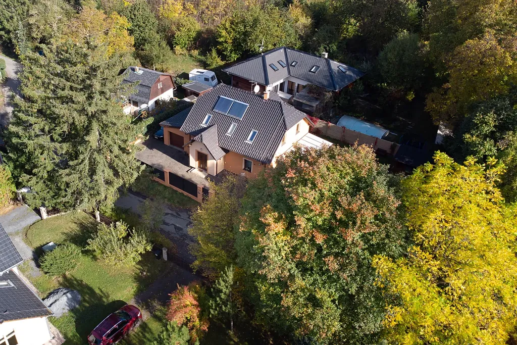 Dům je díky kvalitnímu zateplení a moderním technologiím téměř nízkoenergetický (tepelné čerpadlo, solární kolektory, rekuperace, podlahové topení apod.). Pozemek je kompletně oplocen vysokým betonovým plotem kombinovaným s hliníkovými lamelami, což zajišťuje absolutní soukromí. Vjezd umožňují dvě elektricky ovládané brány, na pozemku pohodlně zaparkujete až 5 osobních aut. Součástí je prostorná garáž s elektrickými vraty, přímým vstupem do domu, technickou místností a samostatnou toaletou.