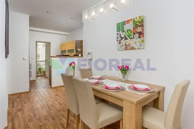 K dispozici je kuchyňský kout s vybavením (myčka, trouba, sklokeramická deska, vestavná mikrovlnná trouba, lednice, mrazák) a vstupem do zimní zahrady pro chvíle oddechu a relaxu při pohledu do vnitrobloku se zelení. Na kuchyň navazuje prostor s jídelním stolem a židlemi, které ale mohou být i v obývacím pokoji, kde je pro ně dostatek prostoru. V obývacím pokoji je k dispozici nábytek (viz fotografie) a před nastěhováním nového nájemce majitelé vymění stávající sedací soupravu za novou. U obývacího pokoje je malý balkón s jižní orientací. Ložnice je zařízená dvojlůžkem, nočními stolky, rozkládací pohovkou a šatní skříní. V koupelně je sprchový kout, toaleta, pračka, sušička a drobný nábytek.