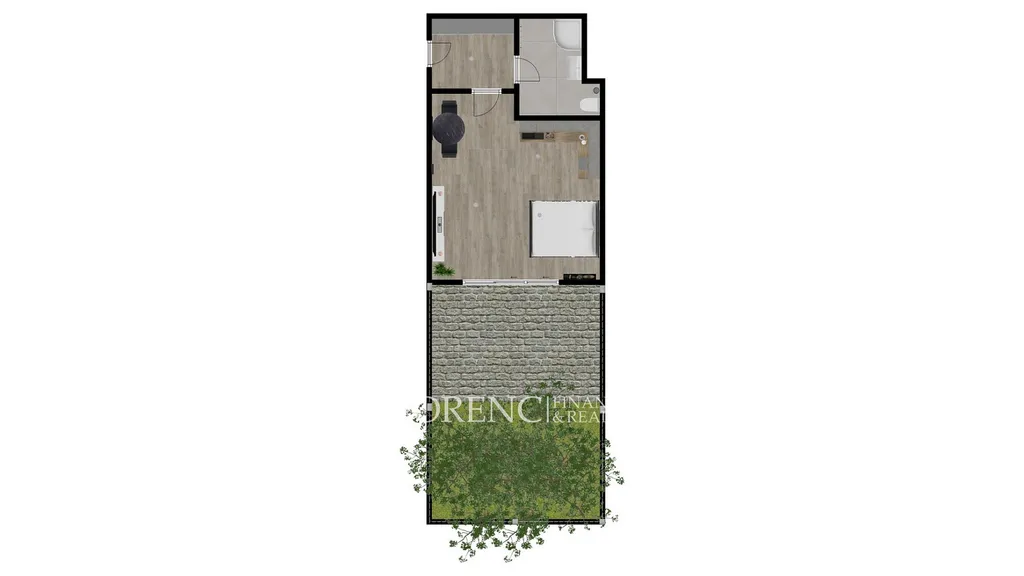Bytová jednotka 1kk má podlahovou plochu 34,5 m² a náleží k ní praktická předzahrádka o velikosti 40m².