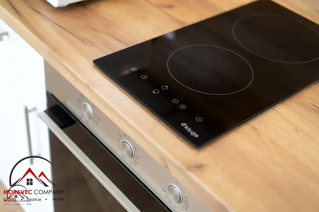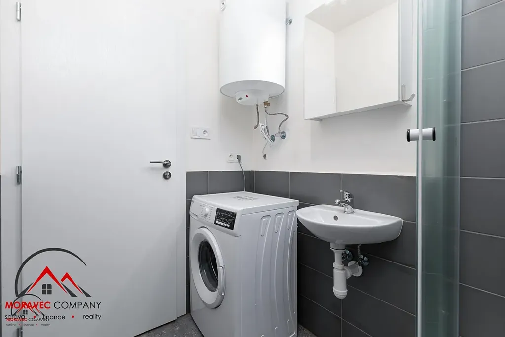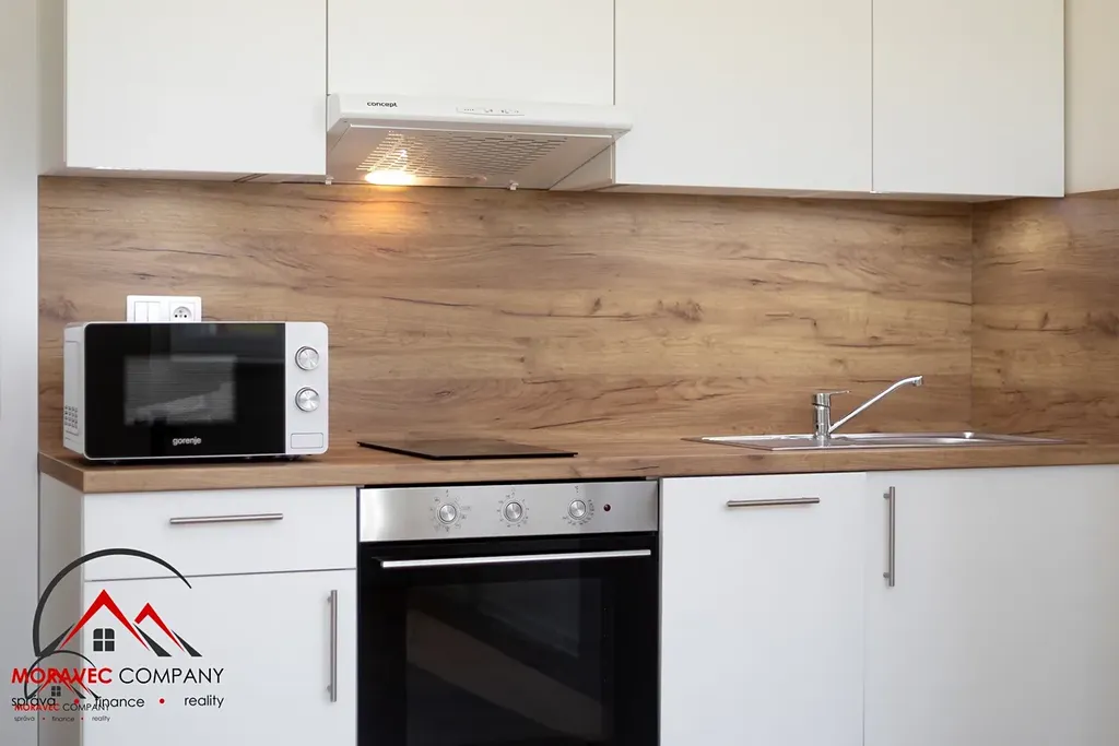 Vybavení bytu zahrnuje kuchyň s elektrickou troubou, indukční varnou deskou, digestoří, zabudovanou myčkou, lednicí a mikrovlnnou troubou. Koupelna je vybavena sprchovým koutem a pračkou, WC je samostatné. Ohřev vody zajišťuje elektrický bojler.