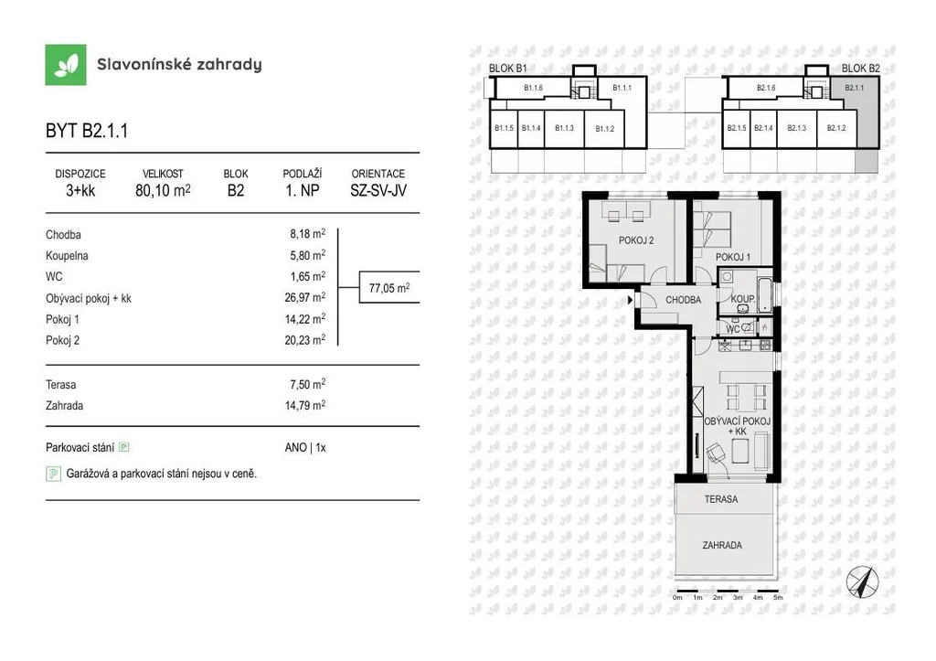 Nabízíme prostorný byt s označením B2.1.1 o dispozici 3+kk, podlahové ploše 80,1 m2 v 1. NP, s terasou 8,4, m2 a soukromou zahradou 16,6 m2 ideální pro rodiny s dětmi, páry nebo jako investiční bydlení.