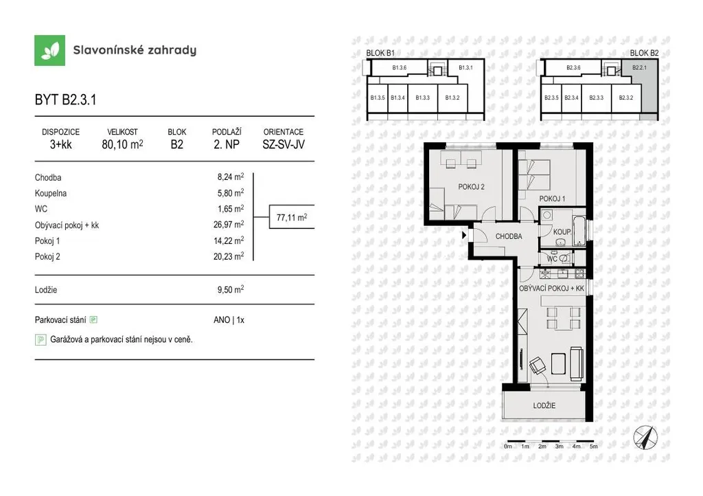 Nabízíme prostorný byt s označením B2.3.1 o dispozici 3+kk, podlahové ploše 80,1 m2 v 3. NP, s balkónem 9,5 m2 ideální pro rodiny s dětmi, páry nebo jako investiční bydlení.