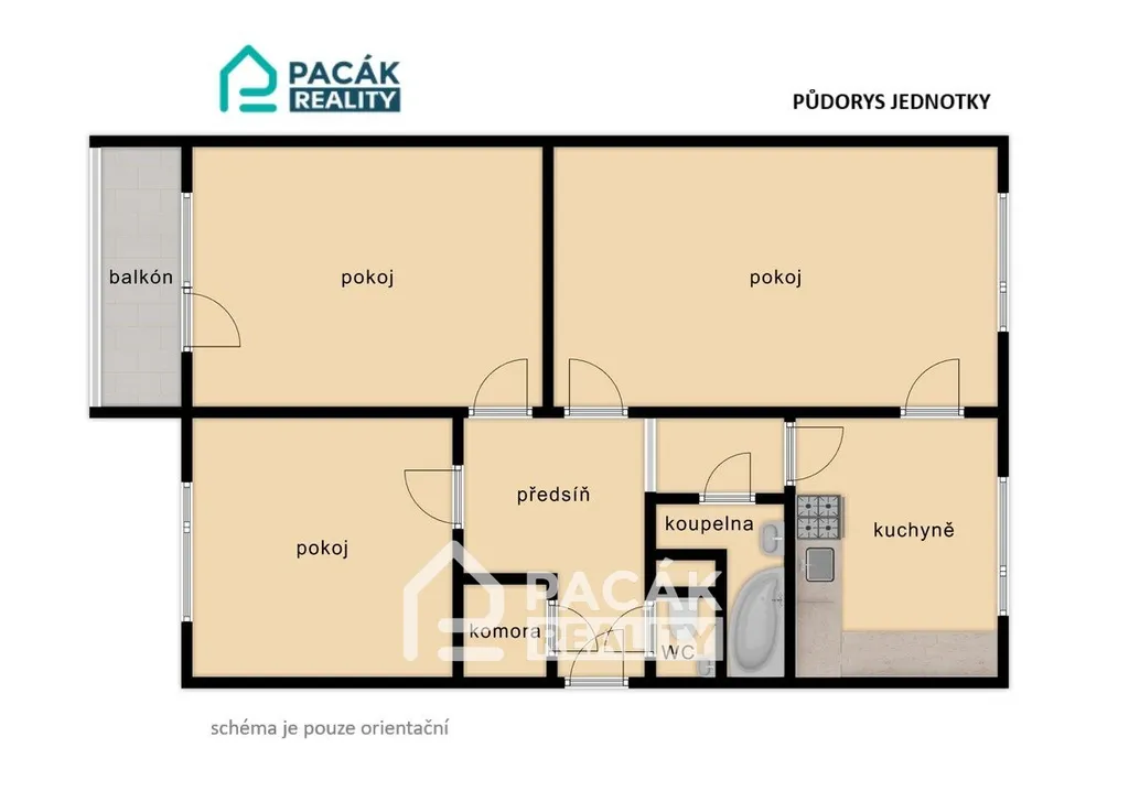 Dispozičně je byt velice dobře a prakticky řešen. Podlahová plocha bytu činí 73m2 + 4m2 balkón ( na jih) + sklep (1,5m2). Obývací pokoj má výměru 21 m2, ložnice 16 m2, pracovna či dětský pokoj 12 m2, kuchyně 13 m2, předsíň, koupelna, samostatné WC + komora. Nová kuchyně s myčkou nádobí. U všech pokojů nové dřevěné zárubně dveří.