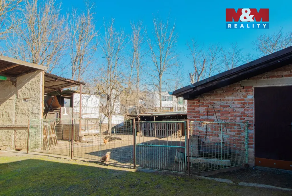 Na pozemku 912 m² je garáž, dílna, přístřešek parkování, skleník, kvelbený sklep, zahrada 340 m².