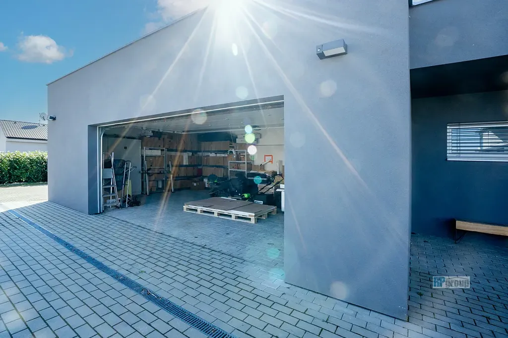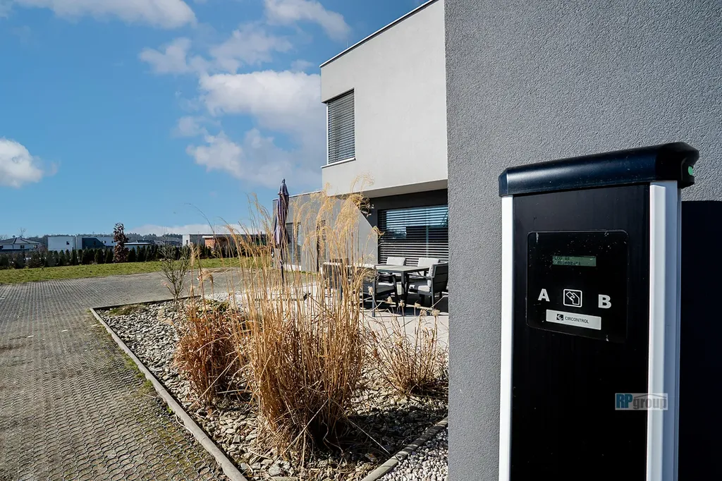 Velkou přidanou hodnotou je parkování na zpevněné ploše kolem domu, za branou. Momentálně zde může pohodlně parkovat 11 aut, z toho 2 místa jsou přímo u wallboxu. Další dvě parkovací místa jsou v prostorné garáži.