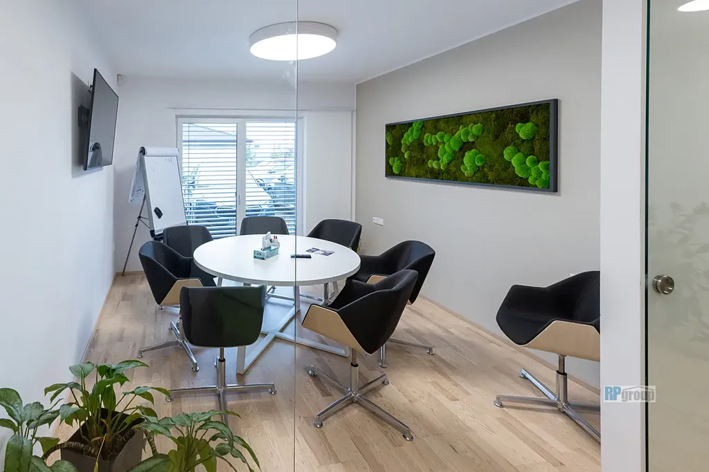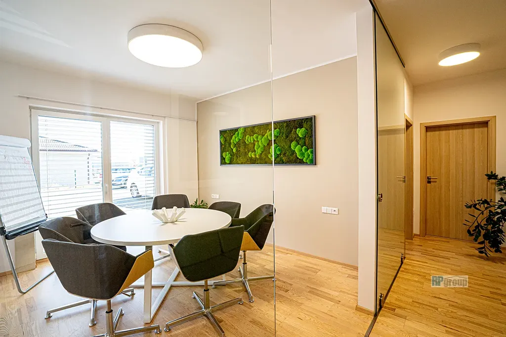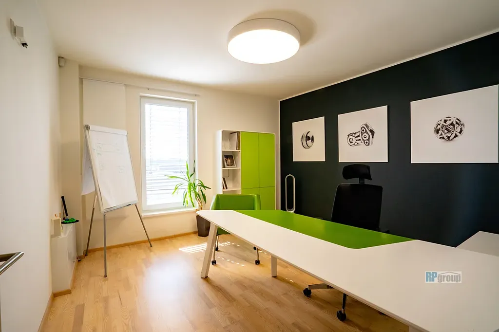 Z přízemí vstoupíte do prostorné chodby se schodištěm do prvního patra, technické místnosti a toalety. Z chodby vstup do největší místnosti o velikosti 53 m2. Vstup na terasu je z východní strany. Dále následuje kancelář/jednací místnost o velikosti 13 m2, kuchyňka 9 m2 a koupelna s toaletou 15 m2 v jižní části domu. V prvním patře pak dům nabízí tři samostatné místnosti/kanceláře o velikosti 15+15+13 m2, a taky další koupelna se sprchou a toaletou 8 m2.