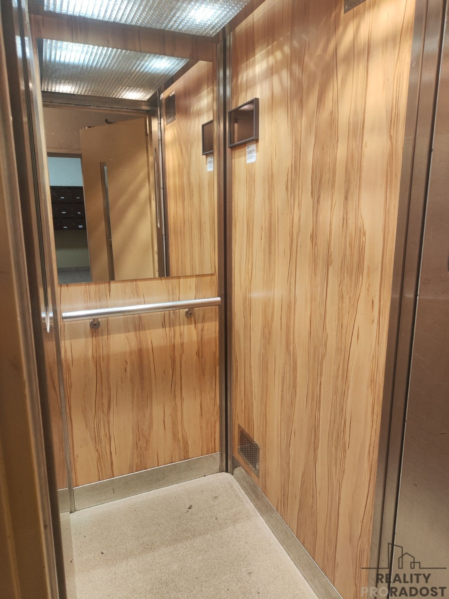 V kuchyni se nachází zachovalá rohová kuchyňská linka s myčkou a naproti lince je ve stejném tónu úložná skříňka. Do obývacího pokoje jsou dva vstupy, takže je možné ho přepažit na dvě místnosti. Okno je stejně jako v kuchyni směrem do ulice. Druhý pokoj má okno do vnitrobloku.