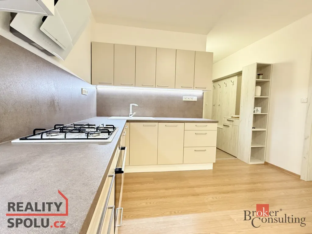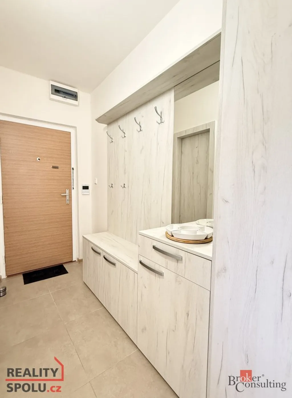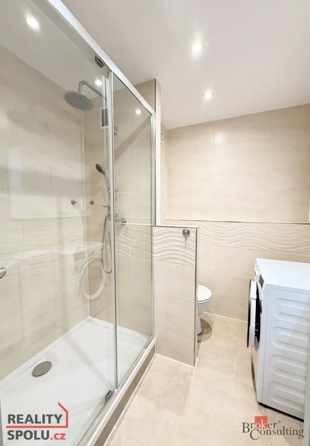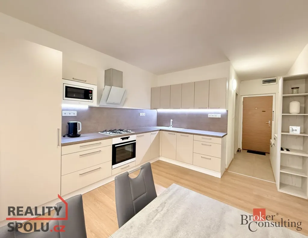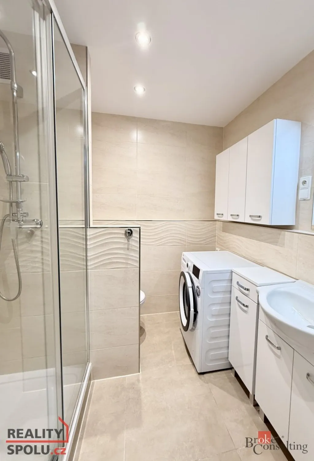 Kuchyňská linka je vybavena kompletní sadou vestavných spotřebičů — k dispozici je mikrovlnná trouba, elektrická trouba, plynový varič, myčka nádobí, a vedle linky zůstává také samostatně stojící lednice. V koupelně je nájemníkům k dispozici pračka, což výrazně zvyšuje komfort bydlení.
