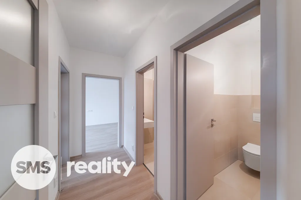 Byt samotný je situován v přízemí se samostatným vchodem. Prostornou předsíní se dostaneme do obývacího pokoje s místem na kuchyňský kout. Okna nabízí dostatek světla a výhled na park. Koupelna je vybavena sprchovým koutem, toaleta je oddělena. V druhém pokoji je dostatek místa pro ložnici a úložné prostory. Podlaha je pokryta vinylem a vytápění je zajištěno elektrokotlem. K bytu lze dokoupit soukromé parkovací stání a sklepní koji.