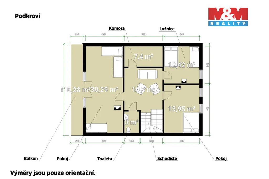 V 1. NP se nachází prostorný obývací pokoj s kuchyňským koutem, dvě ložnice, koupelna, WC a vstup na velkou terasu s dechberoucím výhledem přímo na hrad Kašperk. V podkroví najdeme další tři pokoje, s balkonem výhledem do krajiny, s koupelnou a WC.