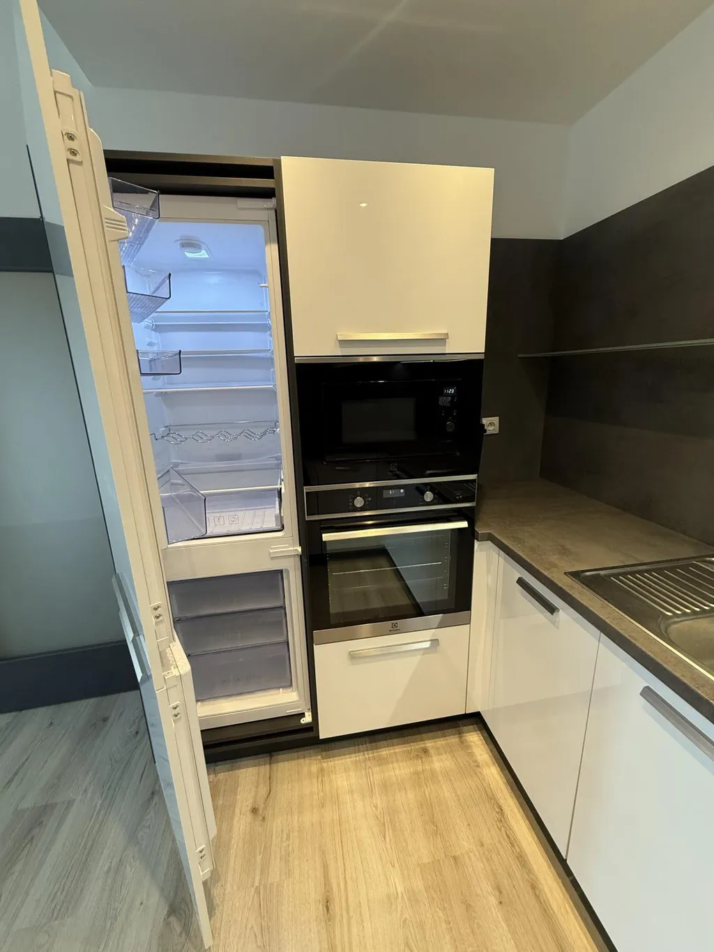Byt je vybaven novou kuchyň.linkou s vestavěnou elektr.troubou, mikrovlnkou, indukční varnou čtyřplotýnkovou deskou, digestoří, lednicí a myčkou.
