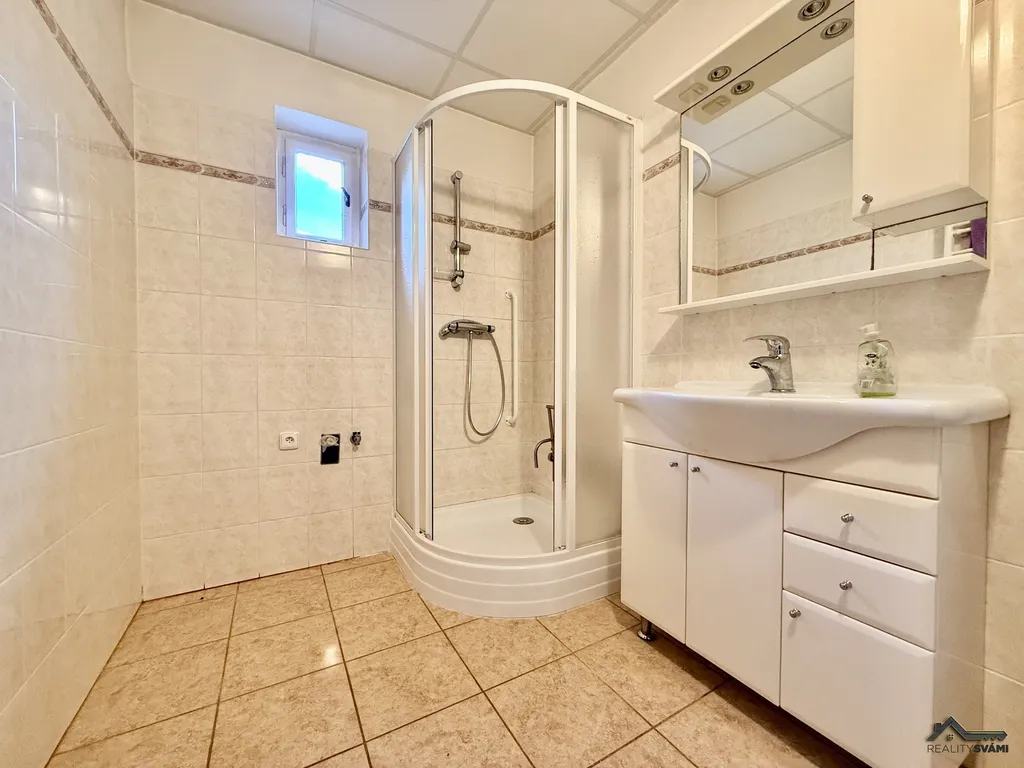Dům je částečně podsklepený, sklep tvoří asi tři čtvrtiny půdorysu a je suchý, bez známek vlhkosti, takže perfektně poslouží jako sklad i technické zázemí. V něm je umístěn dvouletý plynový kotel značky Vaillant o výkonu 35 kW, který zajišťuje vytápění celého domu. Spotřeba plynu se pohybuje kolem 2 000 m³ ročně, což odpovídá částce přibližně 70 tisíc korun, při užívání pouze horního patra pak okolo 45 tisíc. Elektřina je vedena v hliníku s měsíčními náklady kolem 1 400 korun. Voda je částečně v plastových rozvodech, kanalizace je napojena na obecní síť.