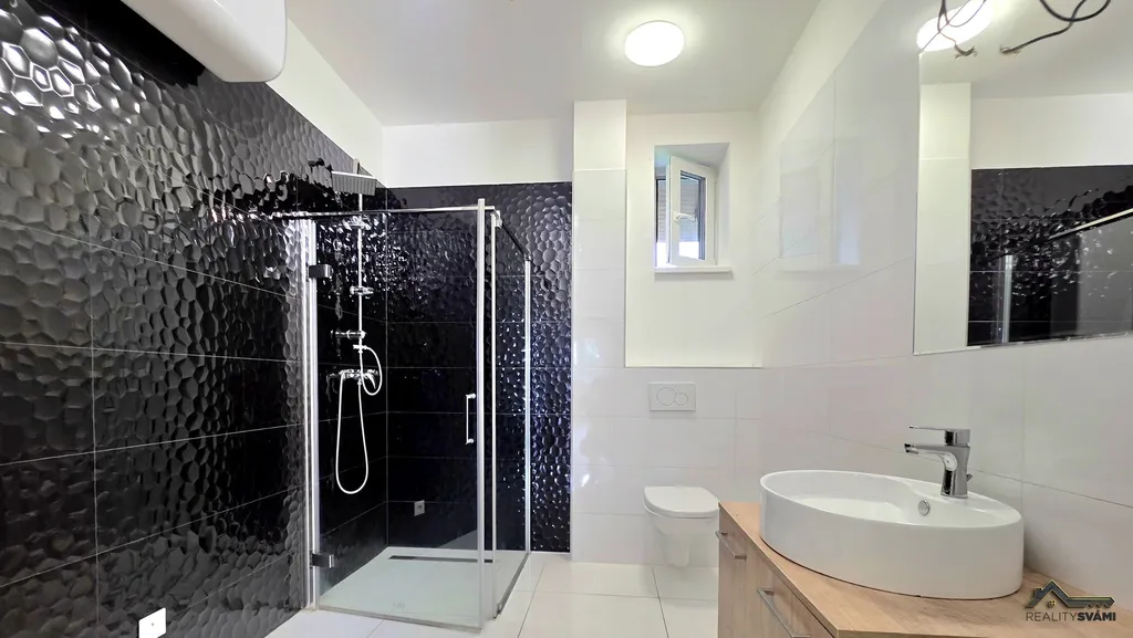Koupelny a WC: dlažba 60×60 cm, obklad 90 ×30 cm (bílá + černý profil).