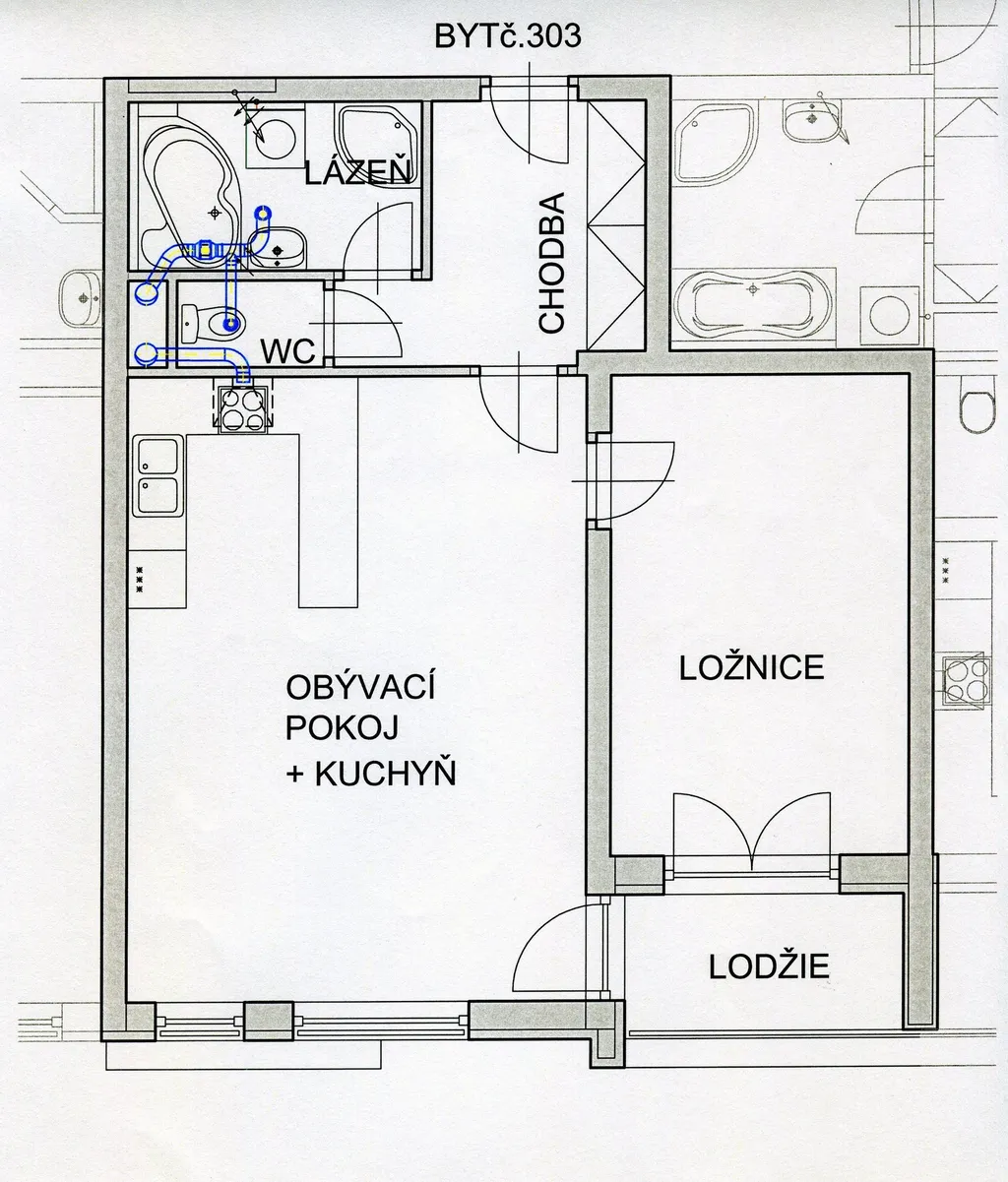 Lodžie je přístupná z obou pokojů. Byt je situován do klidného vnitrobloku, takže je zde klid i soukromí.