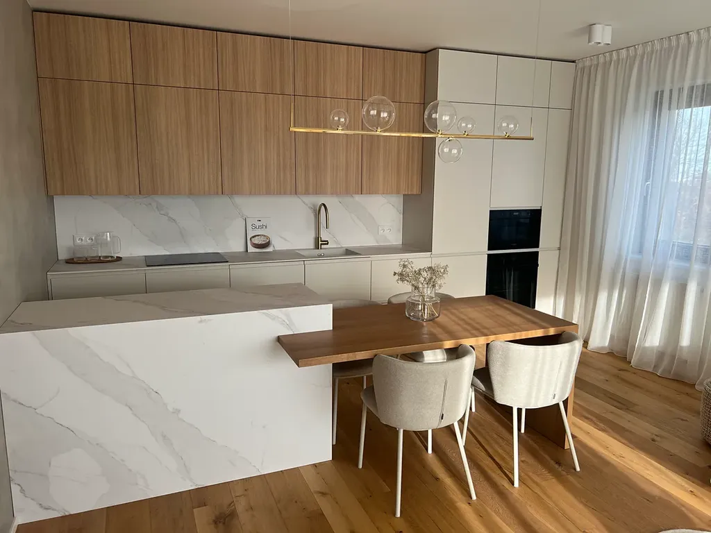 Obývací pokoj je kompletně vybaven designovým nábytkem a kuchyní na míru.