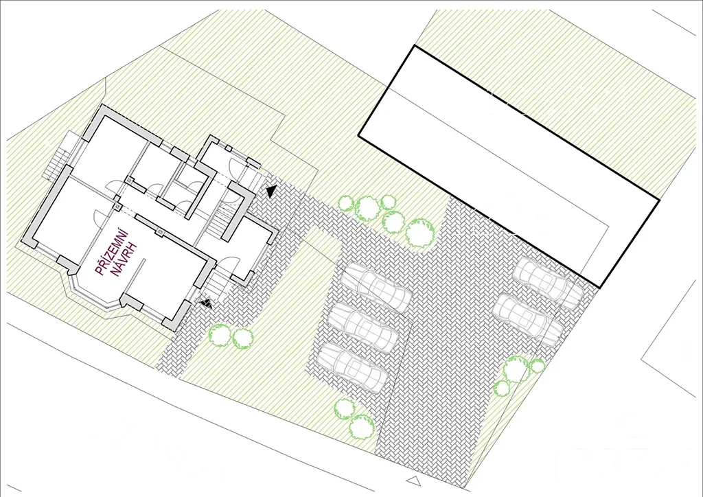 U domu může vzniknout dle studie 5 parkovacích míst na pozemku za bránou. Aktuálně se počítá s využitím pozemku, který je zastavěný hospodářským stavením, a tento po demolici využít na výstavbu druhého rodinného domu. Není to však podmínkou.