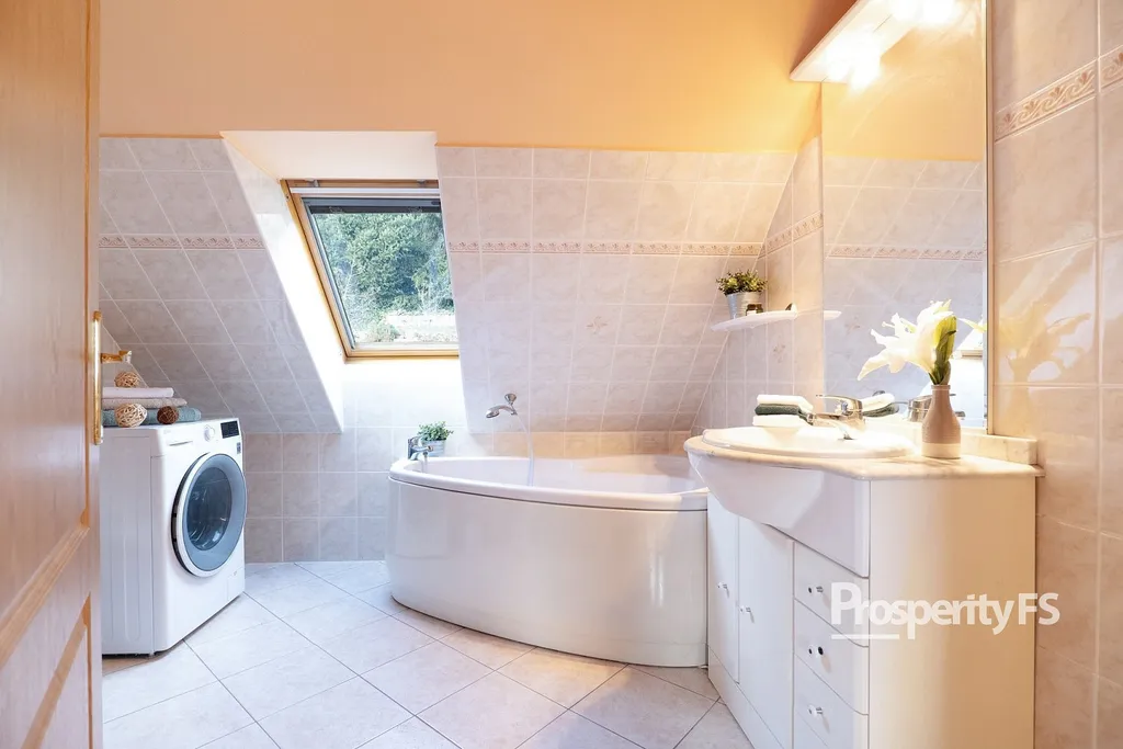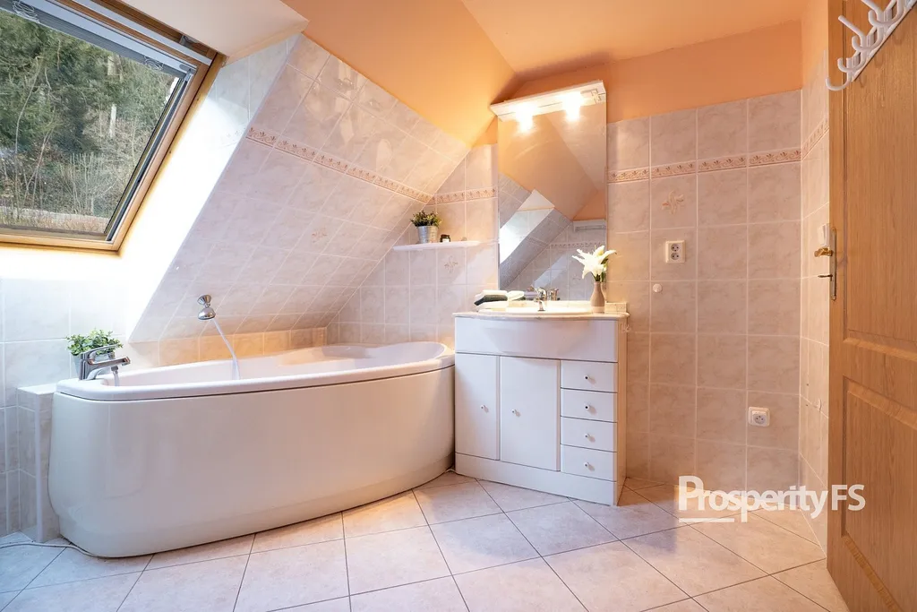 • O teplo domu se starají krásná akumulační kamna, která rozvádí teplý vzduch po celém domě. Dále je k dispozici 2x tepelné čerpadlo vzduch-vzduch a 3x přímotop