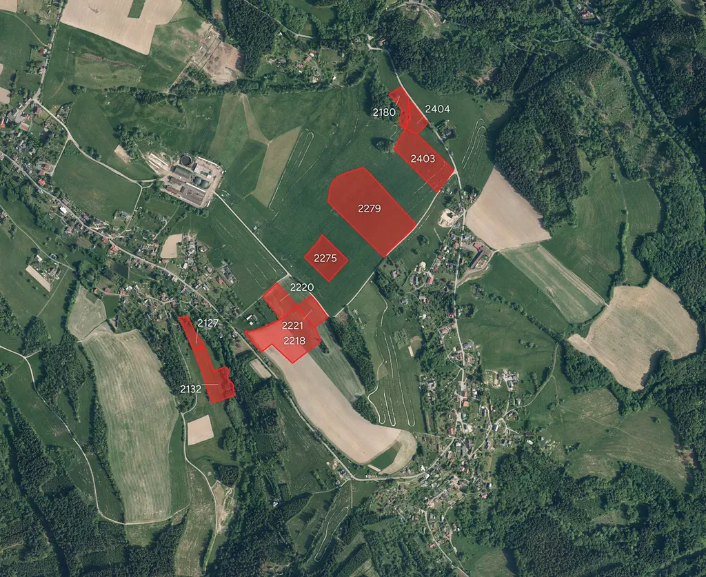 Celková výměra všech parcel činí 117 360 m², přičemž předmětem prodeje je podíl odpovídající výměře 29 340 m².