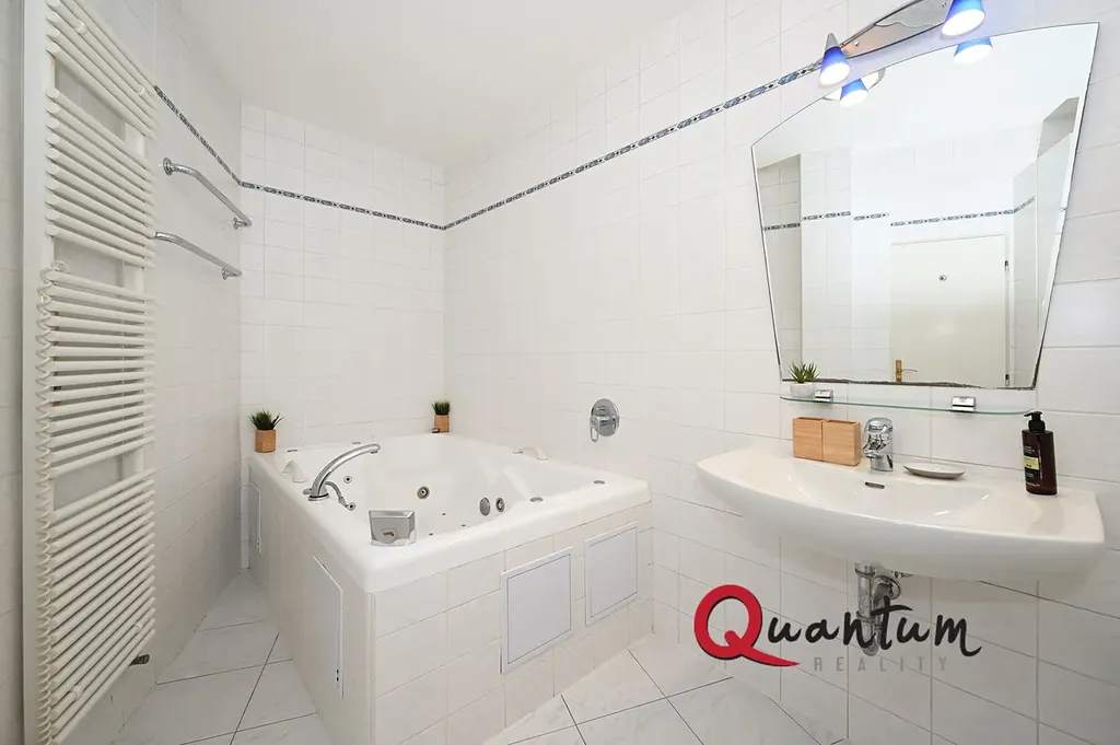 Koupelna disponuje velkou vanou s masážními tryskami, toaletou, umyvadlem a úložnými skříňkami.