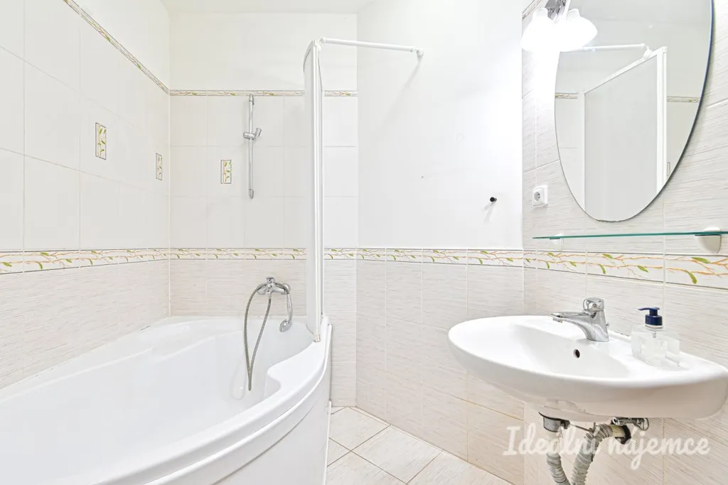 V koupelně najdeme rohovou vanu, umyvadlo a přípojku na pračku. Součástí bytu je také balkon.