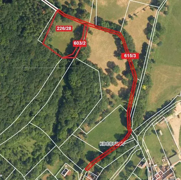 Soubor pozemků v k.ú. Kocourov u Medvědic: p.č. 226/28 druhem trvalý travní porost - pastvina o výměře 2644 m2; p.č. 603/2 druhem ostatní plocha - neplodná půda, mez mezi loukami o výměře 254 m2; p.č. 615/3 (oddělen dle GP 91-146/2024 z p.č. 615/1) druhem ostatní plocha, ostatní komunikace, z části nepoužívaná úvozová cesta o výměře 1182 m2.