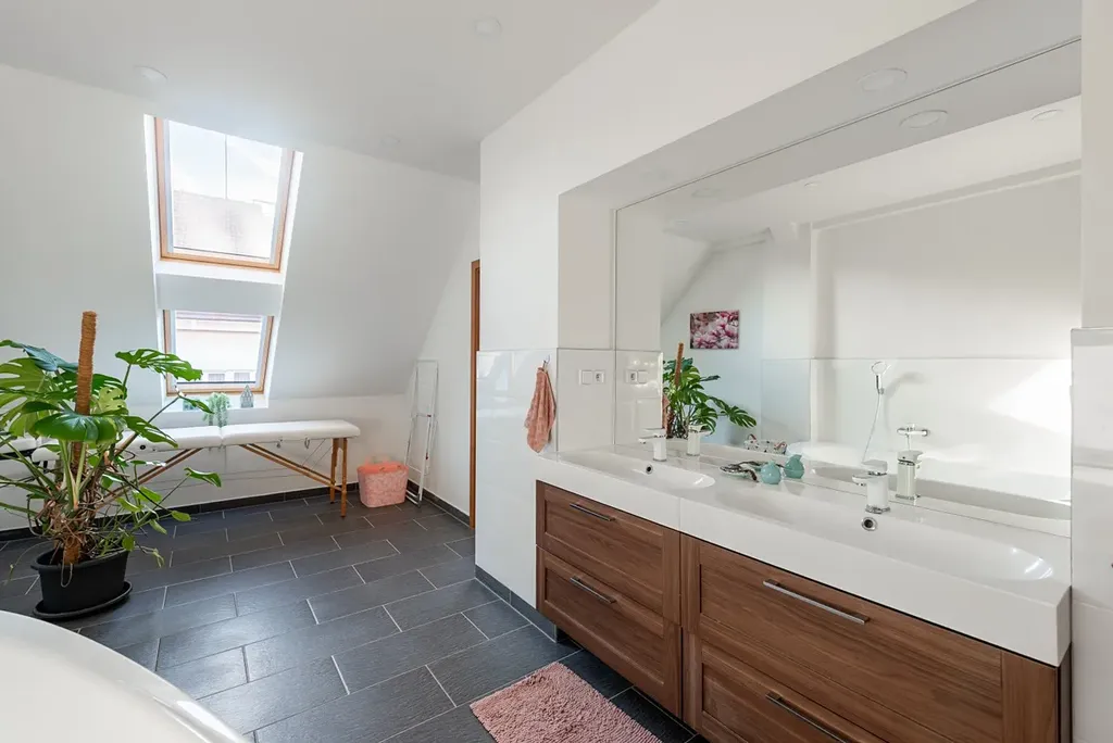 Na spodní úrovni se nachází velká vstupní hala, hlavní ložnice (22 m²) a opravdu výjimečná koupelna (21m2) s vanou pro dva, prostorným sprchovým koutem, dvojitým umyvadlem a vlastní infrasaunou. Příjemný dojem umocňují velká střešní okna, která poskytují dostatek denního světla. Na tomto podlaží je také velká vestavná skříň ve vstupní chodbě (23m2) a samostatná toaleta s plynovým kotlem.