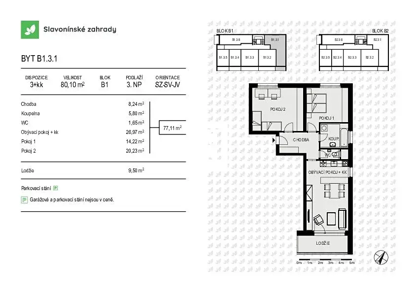 Byt B1.3.1 o dispozici 3+kk má podlahovou plochu 80,1 m², terasa o velikosti 9,5 m² a nachází se ve 3.NP bytového domu s nízkým počtem bytových jednotek.