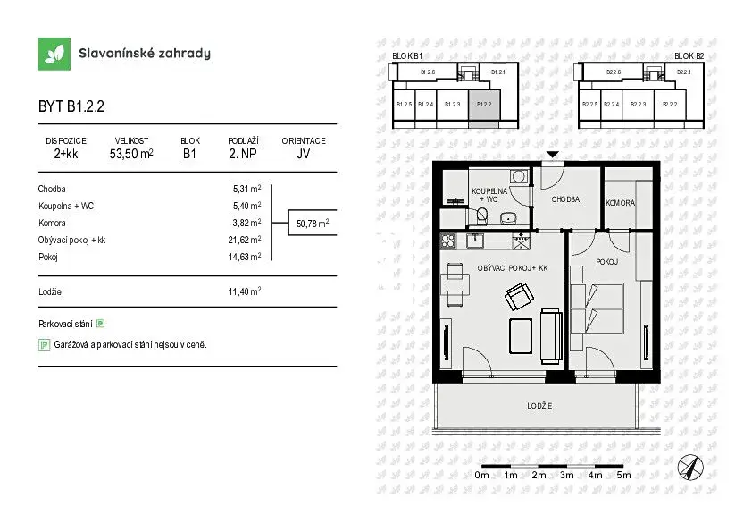 Byt B1.2.2 o dispozici 2+kk má podlahovou plochu 53,5 m² a terasa o velikosti 11,4 m² se nachází ve 2.NP bytového domu s nízkým počtem bytových jednotek.