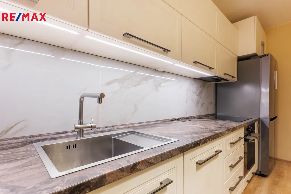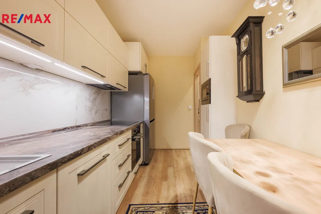 Ve výhradním zastoupení Vám nabízíme k prodeji po kompletní rekonstrukci byt v osobním vlastnictví o dispozičním řešení 3+1 s lodžií na ulici Vlkova, Brno – Líšeň, který se nachází v 3.NP ze 7.NP panelového domu, který prošel kompletní revitalizací. Nemovitost disponuje třemi neprůchozími pokoji, vstupní chodba (6,62m2) kde se nachází vestavná zrcadlová skříň, (zůstává součástí prodeje) dále po levé straně se nachází ložnice (12m2), obytná místnost (17,5m2) se vstupem na zasklenou lodžii o výměře 6m2. Naproti chodbě se nachází menší pokojík (8m2). Dále vstup do kuchyně, kde se nachází nová kuchyňská linka (9,30m2) na míru se všemi vestavěnými spotřebiči značky Electrolux, indukční varná deska, odsavač, horkovzdušná trouba, myčka nádobí značky Electrolux a LG americká lednice, kuchyňská linka zůstane součástí prodeje se všemi spotřebiči, rok realizace 2021. Koupelna (2,70m2) prošla kompletní rekonstrukcí, zděné jádro se sprchovým koutem, příprava pro pračku a sušičku (set nad sebou, který není součástí prodeje), zrcadlová skříňka a umyvadlo se skříňkou. Samostatné WC (0,9m2). Bytová jednotka prošla kompletní rekonstrukcí v roce 2021 včetně elektroinstalace, vodoinstalace, nové vinylové podlahy, zděné jádro, SDK podhledy a stěny, nová plastová okna ( v hodnotě 1,5 mil). V rámci revitalizace došlo k opláštění pláště, nová fasáda, společné prostory, elektroinstalace, lodžie /zasklení/, oprava sklepů atd. Na bytové jednotce nevázne žádné právní zatížení, lze financovat hypotečním úvěrem, který Vám rádi zprostředkujeme za výhodných podmínek. Bytová jednotka bude uvolněna po vlastnickém právu. Více na videoprezentaci a na fotografiích. Bytová jednotka zůstane částečně vybavena (KL, skříň, koupelna). K bytu přináleží sklepní kóje, která se nachází v suterénu bytového domu. Parkování na přilehlém veřejném parkovišti. V Líšni je výborná infrastruktura, obchody Billa, Lídl, Albert, vyhlášená restaurace Havana. Výborná dostupnost MHD tramvaj č. 8 z hlavního nádraží, autobusy, v dosahu letiště Tuřany, škola i školky prvního i druhého stupně, čerpací stanice, pekárna atd. V dosahu Mariánské údolí pro pěší turistiku i cykloturistiku. Více v RK, prohlídky po domluvě s makléřkou. PENB bude doložen ke Kupní smlouvě, nízké provozní náklady. Energetická třída C. Evidenční list na vyžádání u prohlídky. Více si řekneme na osobní prohlídce.