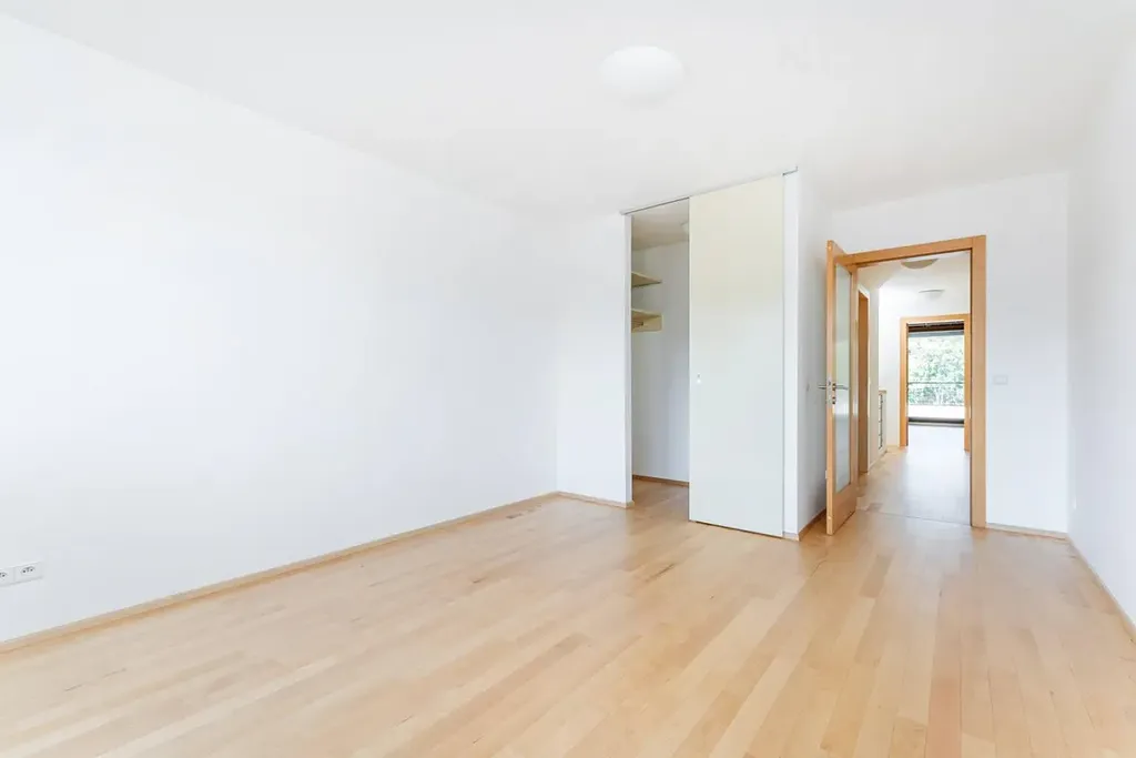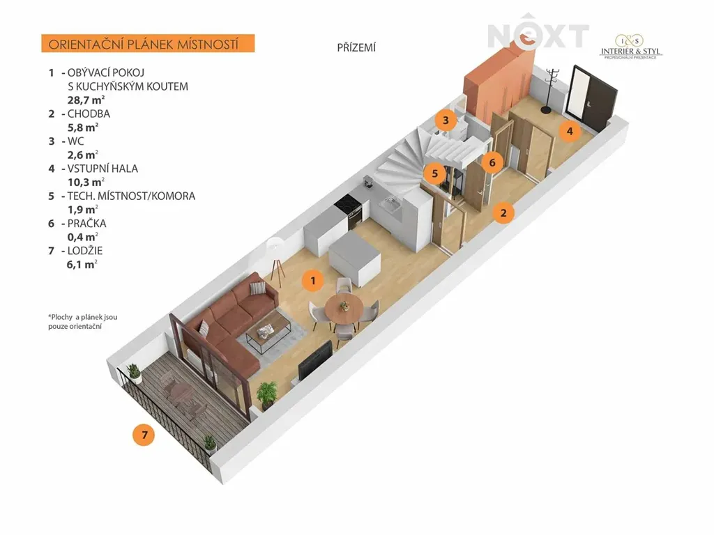 Dispozice bytu: prostorná vstupní chodba s vestavěnou skříní, obývací pokoj s kuchyňským koutem (vestavěné spotřebiče) s výstupem na terasu, wc s umyvadlem, po schodech do patra, kde jsou 2 samostatné pokoje, oba s vlastní šatnou, koupelna s vanou vč. wc a bidetu, po celé délce chodby je vestavěná skříň. Velmi pěkný, vzdušný a prakticky řešený moderní byt s dostatkem úložných prostor.