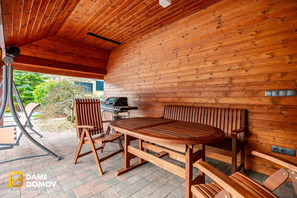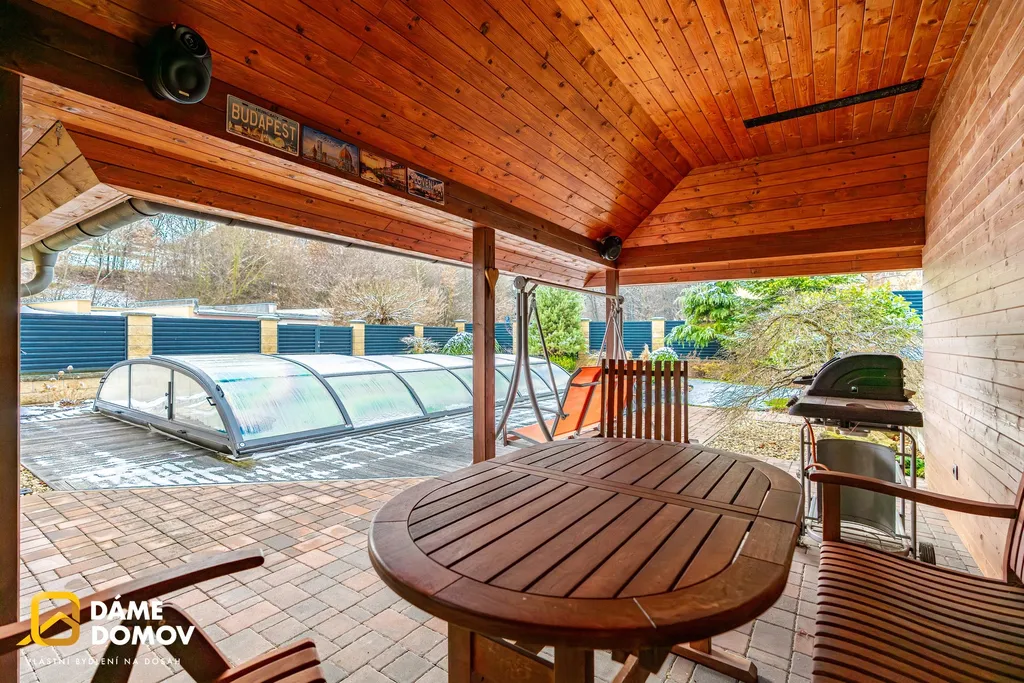 Velkým benefitem jsou také solární panely, které neslouží jen k vyhřátí bazénu, ale v letních měsících pomáhají i s ohřevem vody pro domácnost – úsporné řešení a vyšší komfort bydlení.