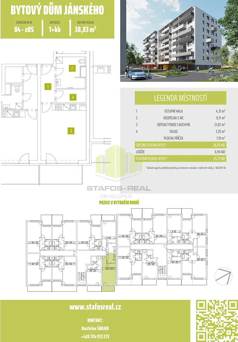 Začněte Vaší novou životní kapitolu bydlení a vychutnejte si radost z bydlení v zbrusu novém bytě. Prověřujeme evidenci exekucí, insolvencí a dluhů na zdravotním pojištění našich potenciálních nájemníků. Pro lepší představu o tomto bydlení vám doporučujeme shlédnout virtuální prohlídku, která vám také poskytne možnost změřit jakýkoliv rozměr tohoto bytu. Volné od listopadu/prosince 2025. Kompletní nabídku bytů v domě najdete na našich stránkách STAFOS-REAL.
