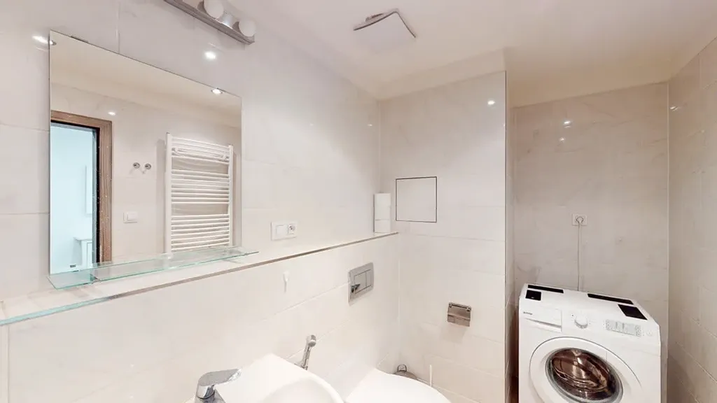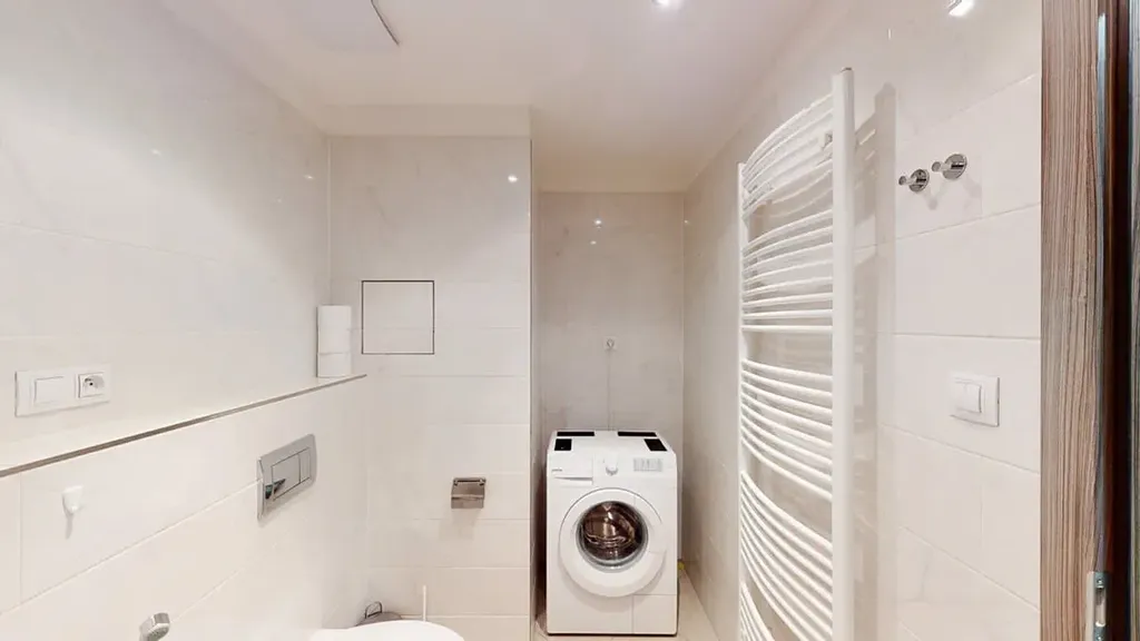 • Koupelnu s vanou, umyvadlem se skříňkou, zrcadlem a pračkou