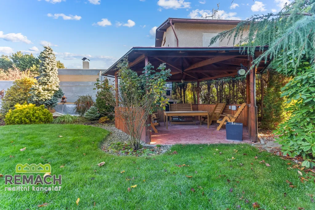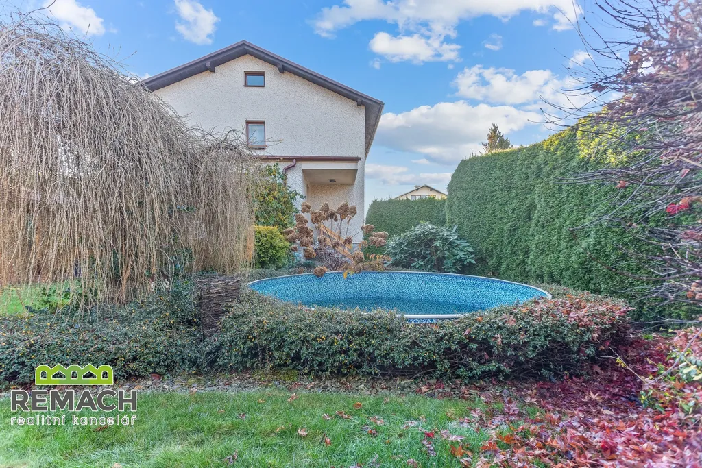 Velkorysá zahrada s vlastní studnou, podzemní nádrží 3 m3 a automatickým zavlažováním trávy, keřů a stromů, slouží jako ideální prostor pro rodinné grilování, pikniky a odpočinek na čerstvém vzduchu.