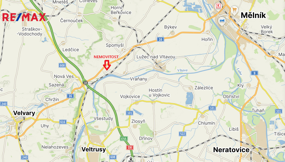 Poloha v blízkosti dálnice, vyhledávané obce Vraňany a údolí řeky Vltavy.