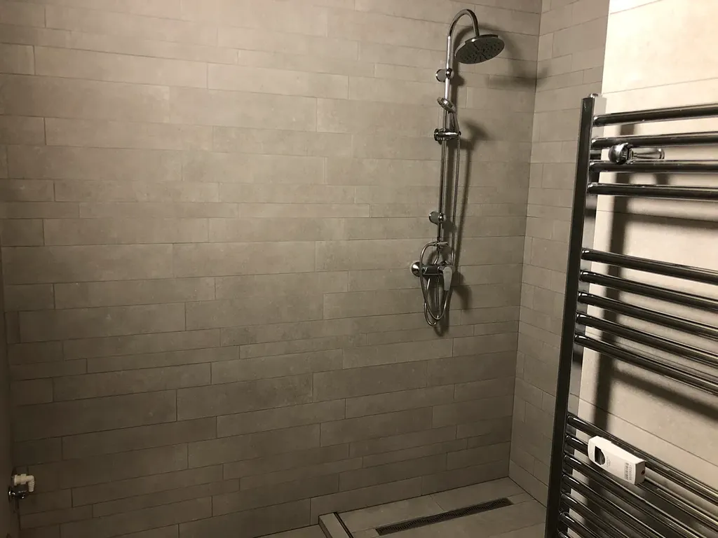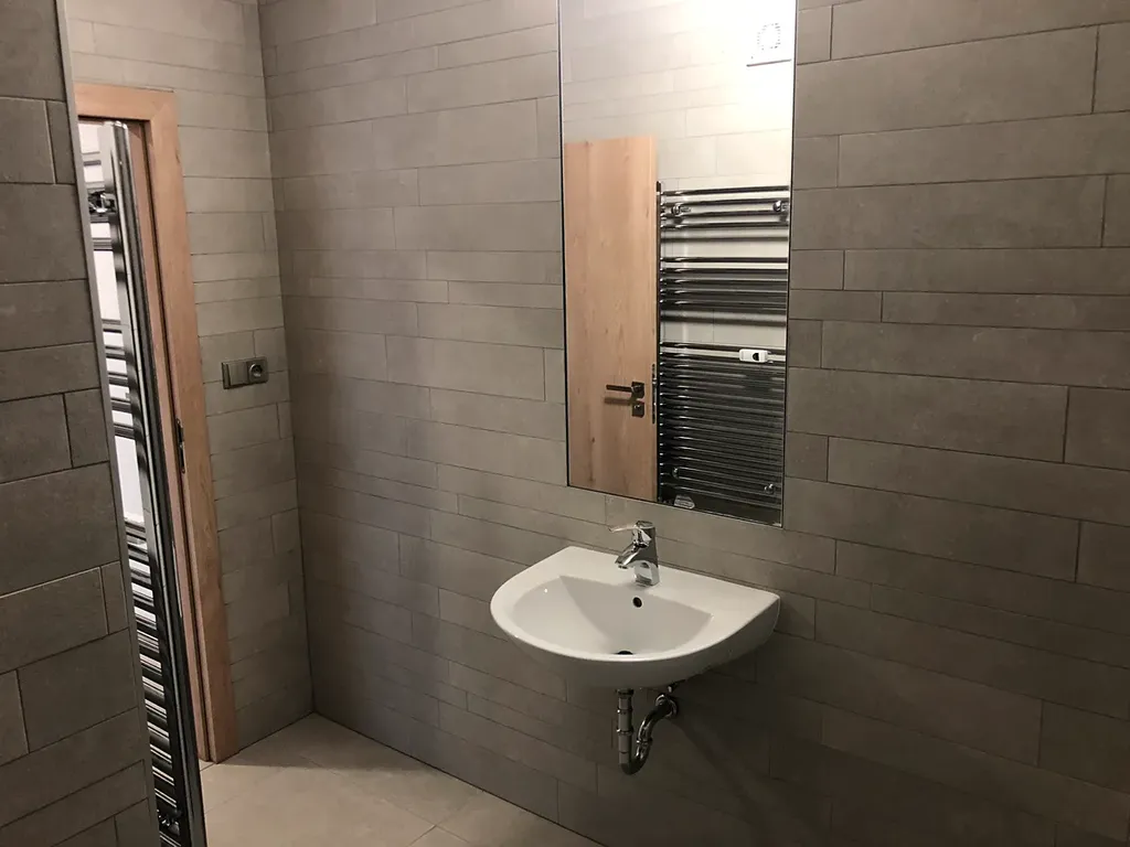 Koupelna má sprchový kout a nachází se zde také připojení na pračku. Toaleta je umístěna samostatně.