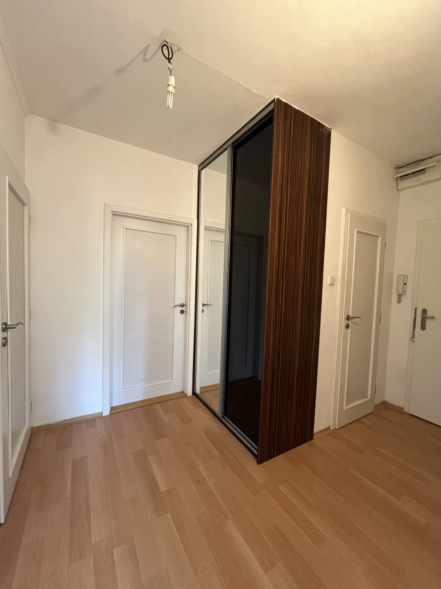 Při vstupu do bytu uvidíte prostornou chodbu s vestavnou skříní, se vstupem do koupelny, kuchyně, obývacího pokoje a dvou neprůchozích pokojů, to zajišťuje soukromí. . Dispozice nabízí velkou koupelnu s umyvadlem, rohovou masážní vanou a místem pro pračku. Toaleta je umístěna samostatně.