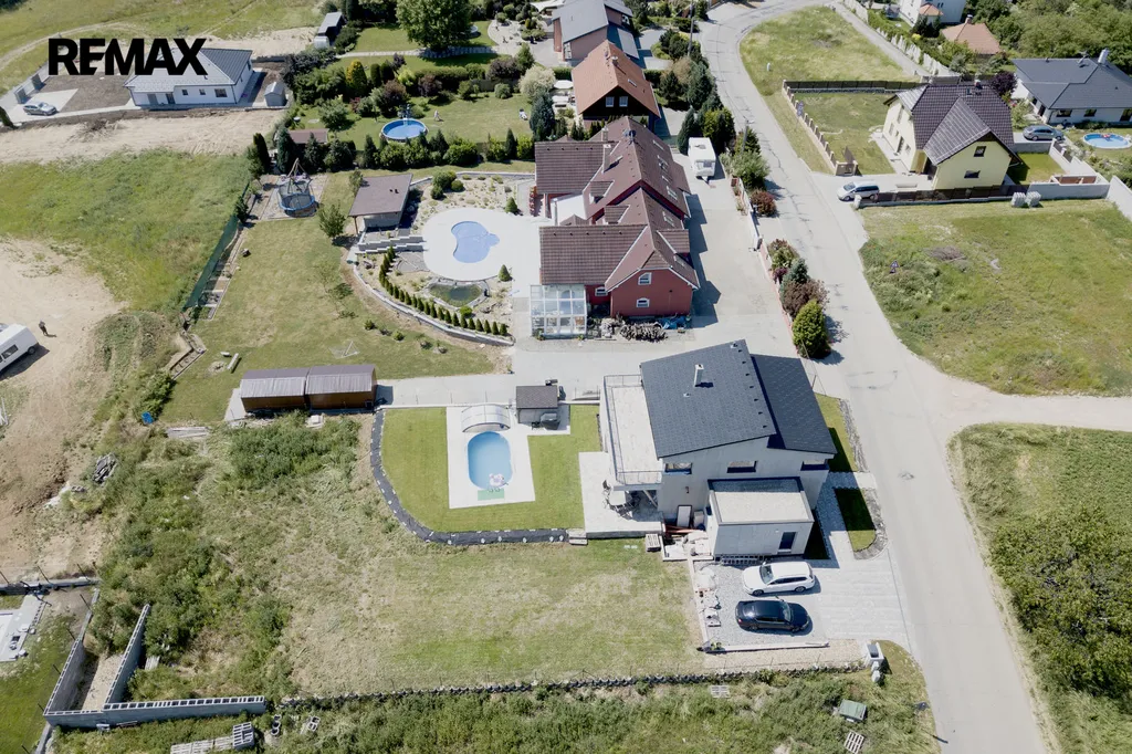 Vedle domu se nachází parkovací stání pro 2 auta ( se základovou deskou na dvojgaráž ) o výměře 56 m2. Před domem a v části zahrady za domem je instalován samo-zavlažovací systém. Na zahradě se nachází zastřešený bazén ( 6x3 m, hloubka 1,5 m), vytápěný tepelným čerpadlem a zahradní domek.