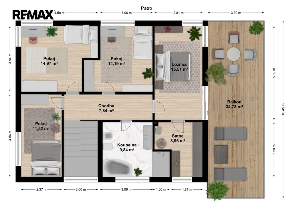 2NP: chodba 8 m2, šatna 11,5 m2, pokoj 15 m2, pokoj 14 m2, ložnice 15,5 m2 se vstupem na balkón o výměře 35 m2 a do šatny 9 m2, koupelna + WC 10 m2 ( tuto místnost je třeba dokončit).