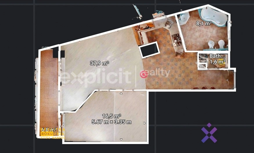 Po vstupu do bytu vás přivítá otevřený a světlý prostor. Po pravé straně zádveří se nachází samostatné WC, pračka a sušička. Chodba dále vede ke koupelně vybavené vanou, velkým umyvadlem, toaletou a bidetem. Následně plynule přechází do kuchyňské části bez dveří. Kuchyňskou linku tvoří vestavná trouba, kombinovaná varná deska a digestoř, rohový dřez, myčka nádobí, dostatek skříněk, vestavná mikrovlnná trouba a vkusný regál na víno. Pracovní plocha je prakticky u okna. Hlavní obývací prostor navazuje na lodžii a dvojí dveře na další pokoj, který lze příčkou rozdělit na půl. Celkově byt působí čistě, svěže a nabízí velmi příjemné bydlení. V celém bytě je instalováno podlahové vytápění.