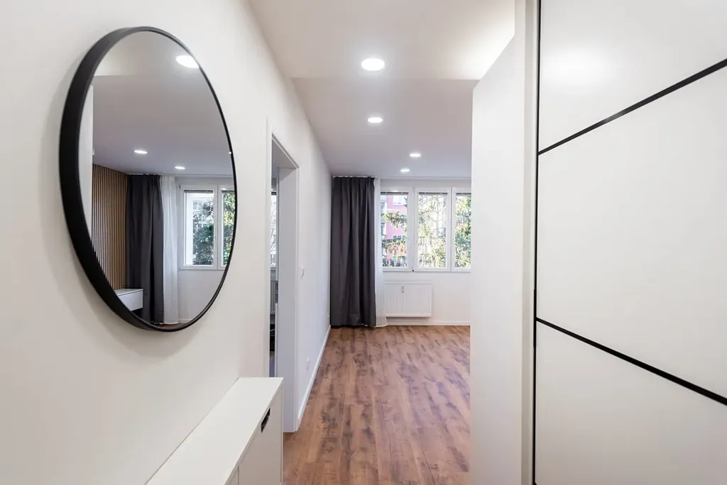 Koupelna prošla při kompletní rekonstrukci dechberoucí proměnou, která znamenala změnu dispozice i nadčasový design. Kombinace bílých velkoformátových obkladů, imitace dřeva na podlaze a ve sprchovém koutu, elegantní podomítkové baterie, kulaté černé umyvadlo a zrcadlo. Zvětšený sprchový kout je opatřen skleněnými dveřmi a celodenní únavu můžete ze sebe smýt pod sprchou se systémem padajícího deště. Toaleta je se systémem Geberit a prostor chytře šetří elegantní posuvné skleněné dveře.
