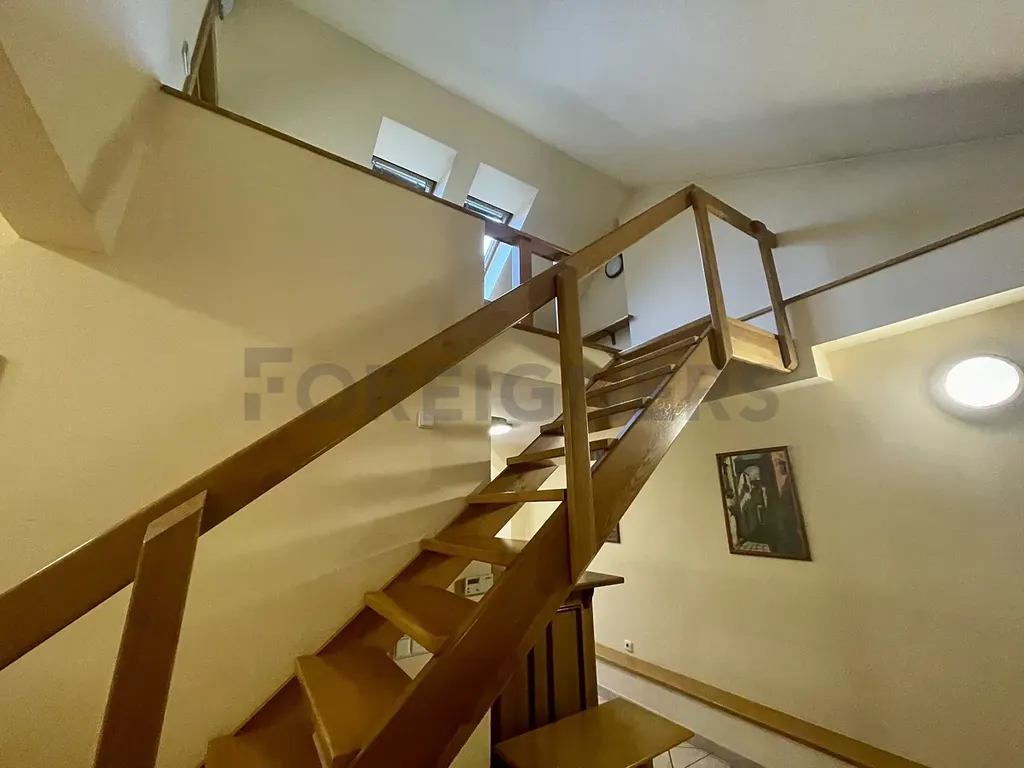 Po schodech z chodby se dostanete do otevřeného mezonetového prostoru, kde je umístěna jednolůžková postel a psací stůl, což poskytuje další možnost spaní pro hosty nebo nenáročné druhé pracovní místo.