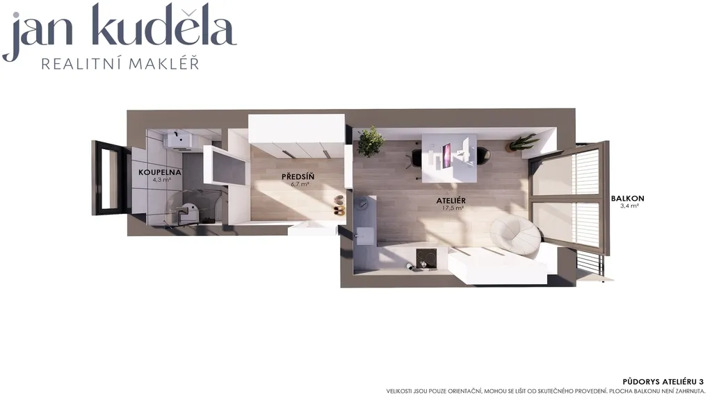 Při vstupu do bytu se nacházíte v předsíni s vestavěnou skříní přes celou šířku chodby, která poskytuje nadstandardní úložný prostor. Z předsíně je vstup do koupelny se sprchovým koutem, toaletou a místem pro pračku - aktuálně už se v bytě pračka nachází. Hlavní obytný prostor je propojen s kuchyňským koutem vybaveným vestavěnou myčkou, troubou, indukční varnou deskou a samostatnou lednicí. Z pokoje je vstup na balkon orientovaný do klidné části okolí.