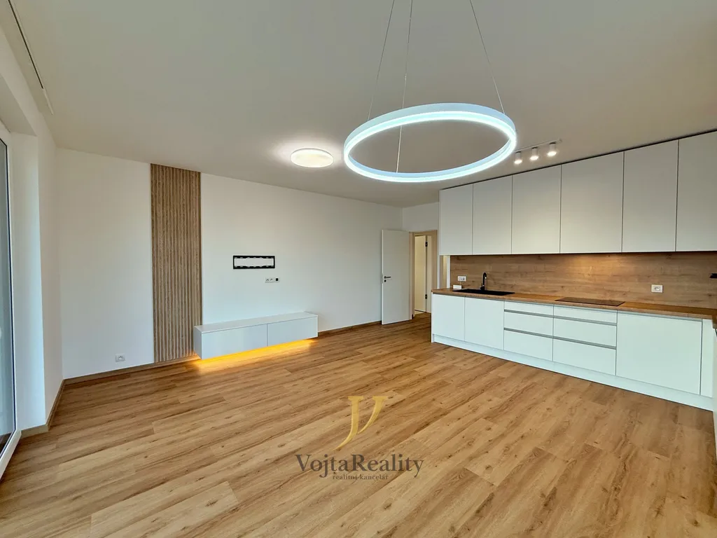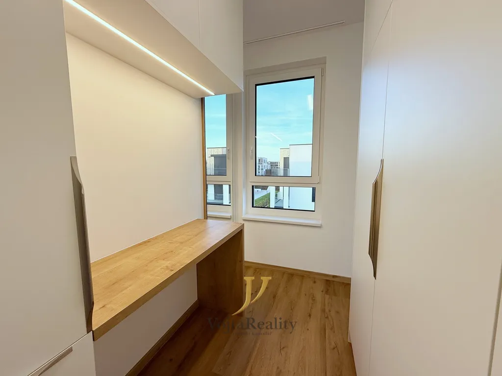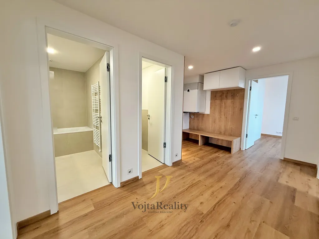 Dispozice bytu je navržena s důrazem na komfort, funkčnost a dostatek úložného prostoru. Vstupní chodba je vybavena vestavěným nábytkem s nočním osvětlením. Obývací pokoj je propojen s moderní kuchyní plně vybavenou spotřebiči Electrolux. Ložnice nabízí praktickou šatnu, pracovní kout a přímý vstup na vlastní terasu. Další pokoj lze využít jako dětský pokoj, pracovnu nebo pokoj pro hosty. Koupelna je vybavena vanou se sprchovou zástěnou, umyvadlem a úložnými prostory, toaleta je oddělená. Nechybí ani technická místnost s přípravou na pračku a sušičku.